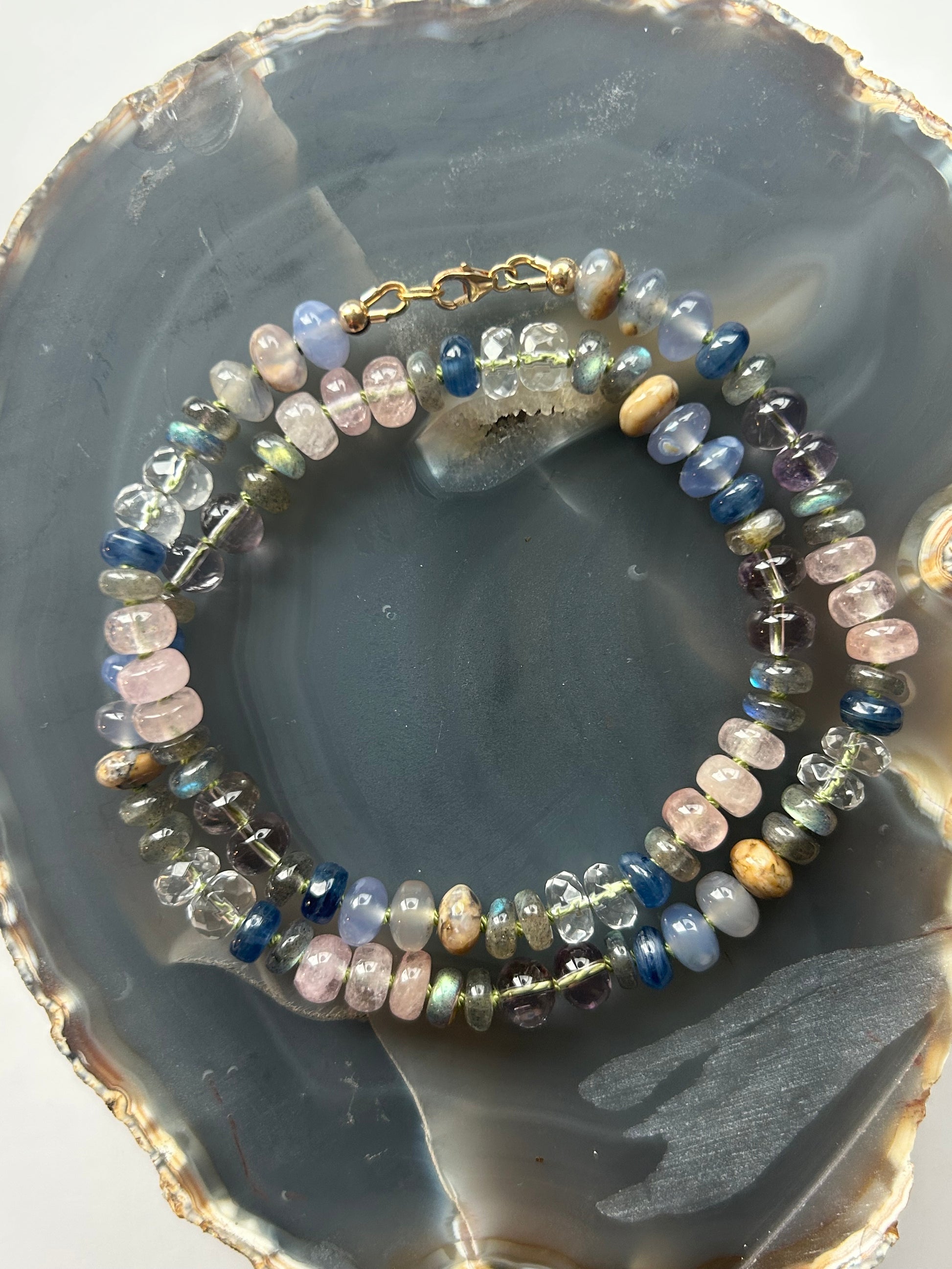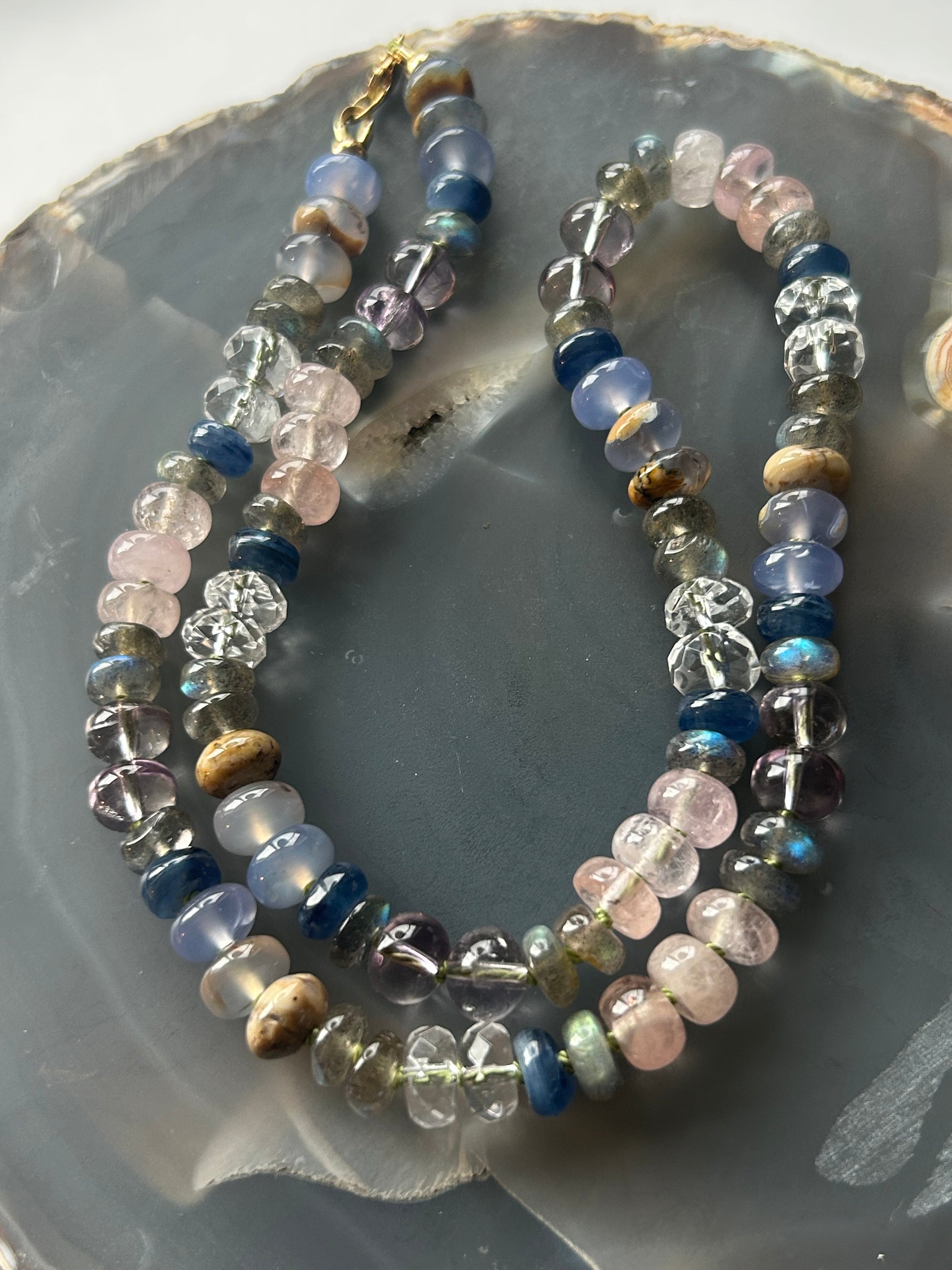 • Gemstones: 8mm clear quartz, Labradorite, lavender amethyst, morganite, blue chalcedony, kyanite