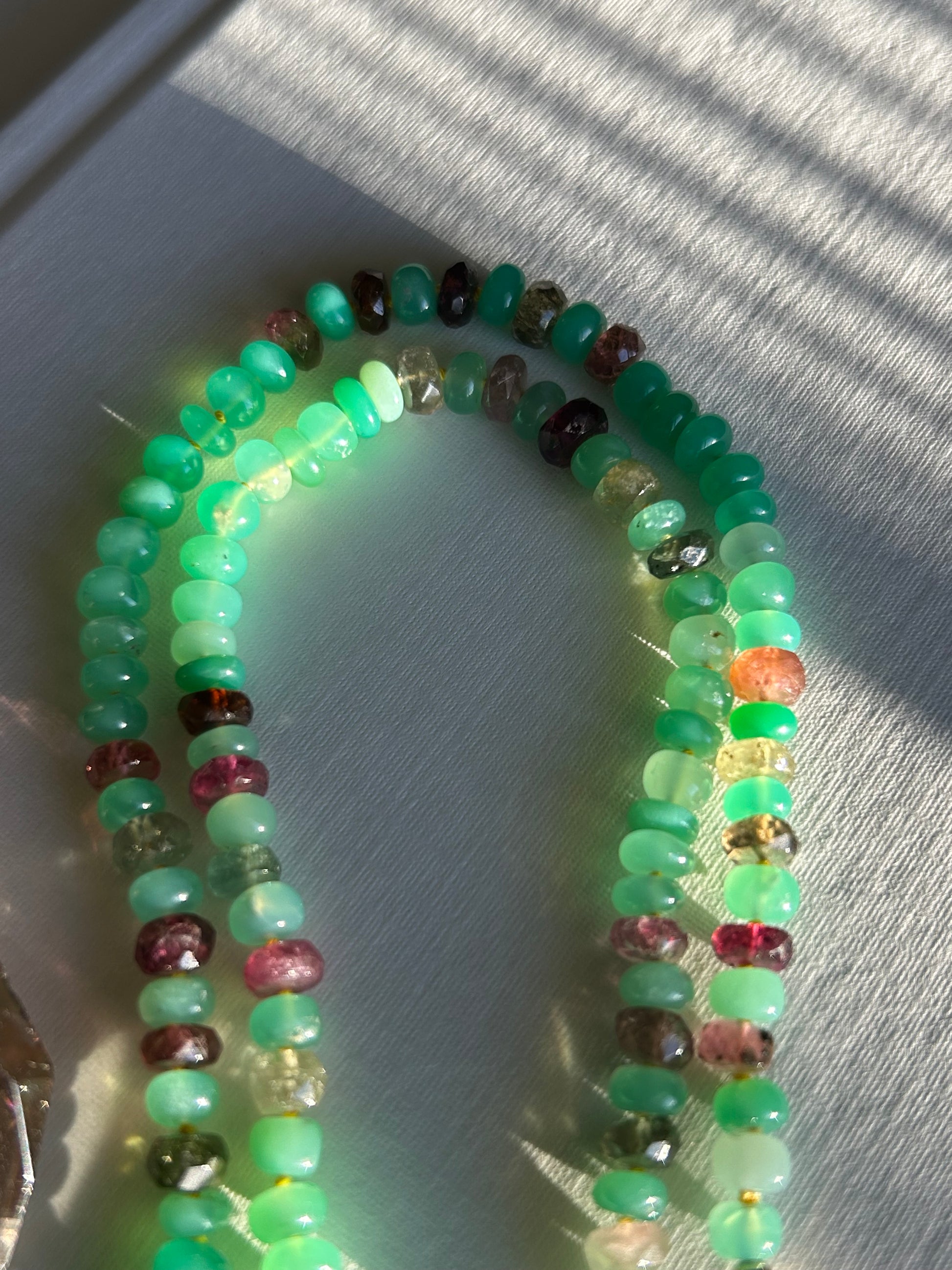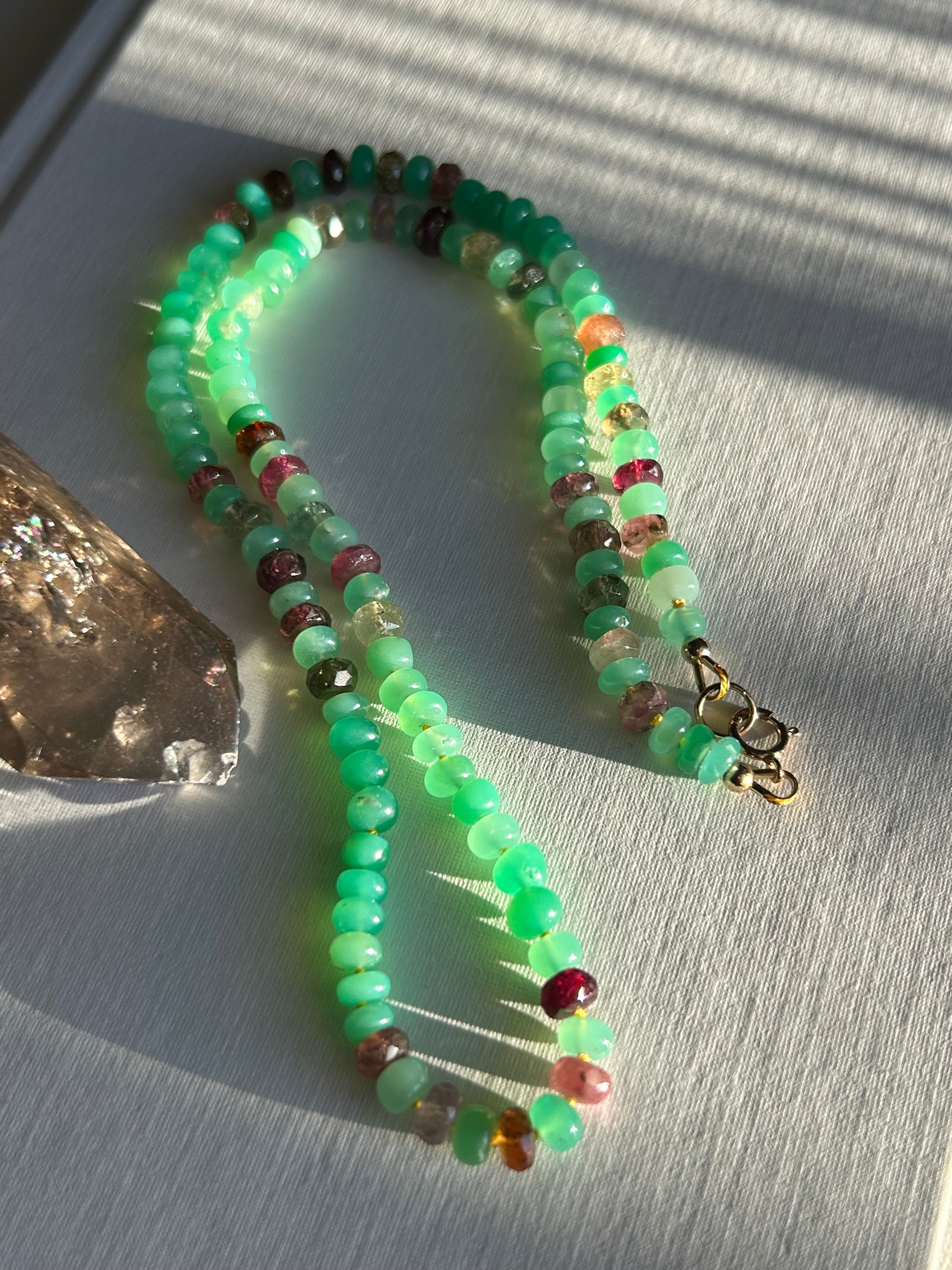 • Gemstones: 5mm Chrysoprase and faceted tourmaline rondelles