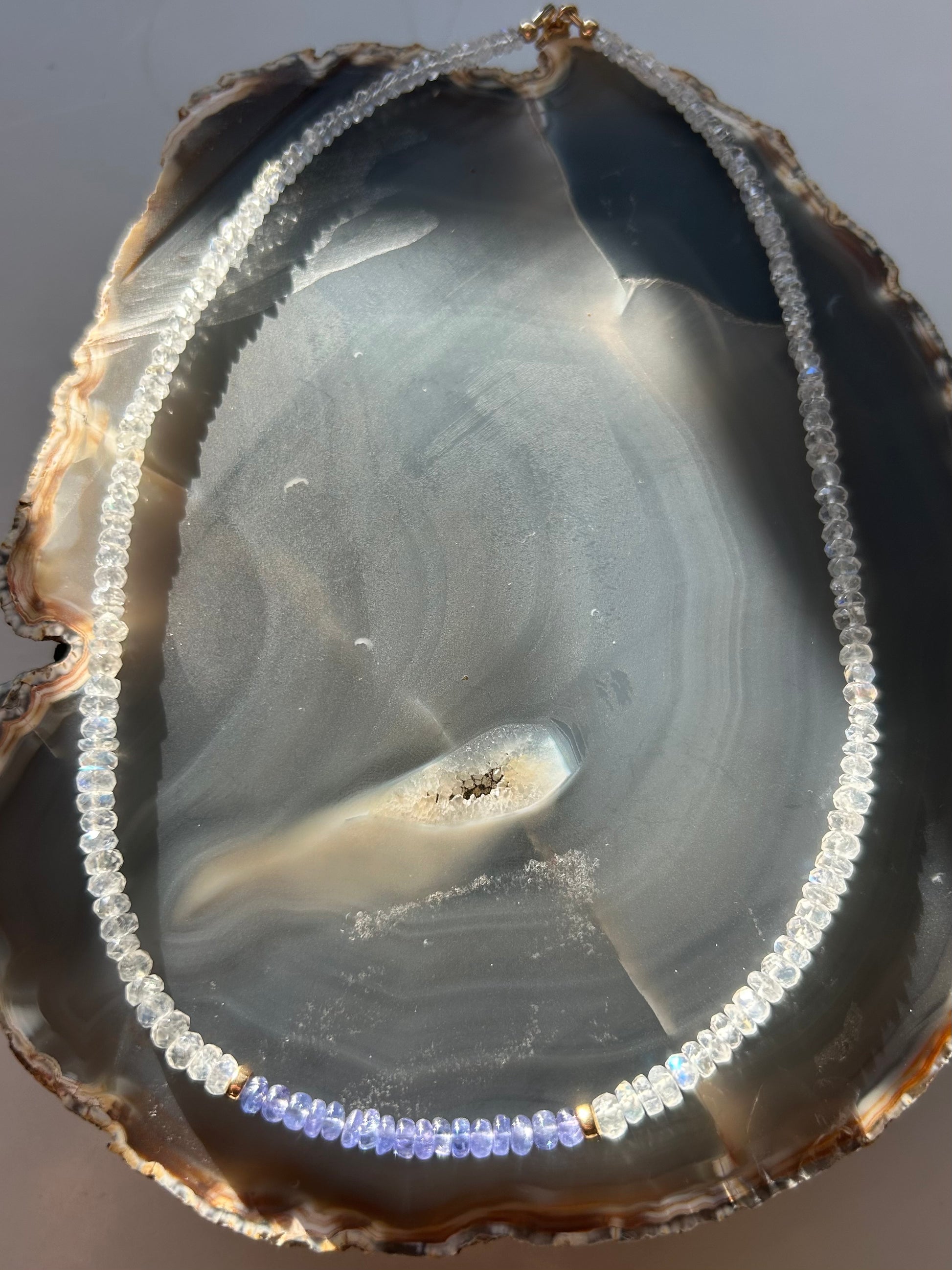 This piece features 3-5mm blue flash white moonstone and tanzanite, complemented by 14k gold-filled rondelles and other components.